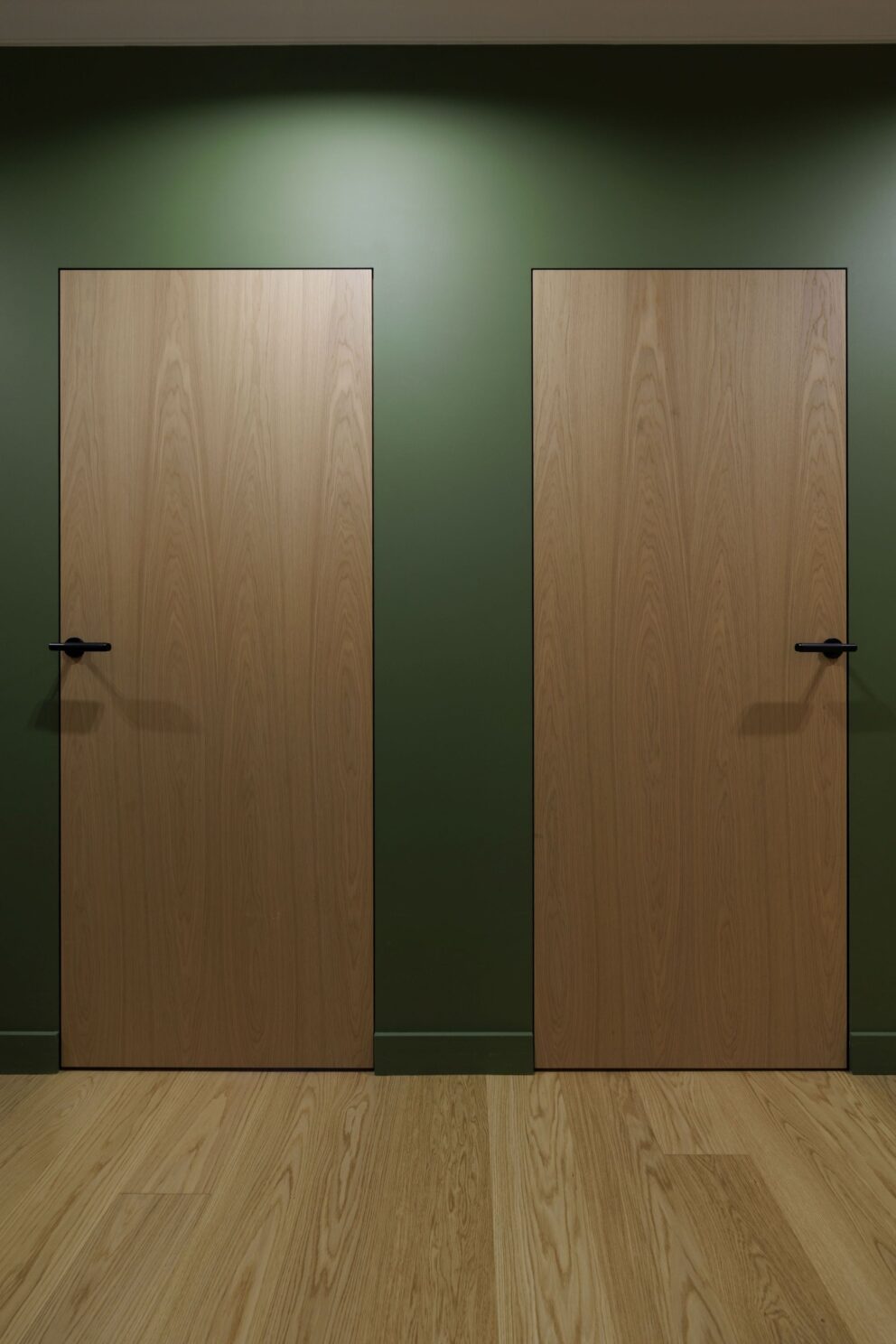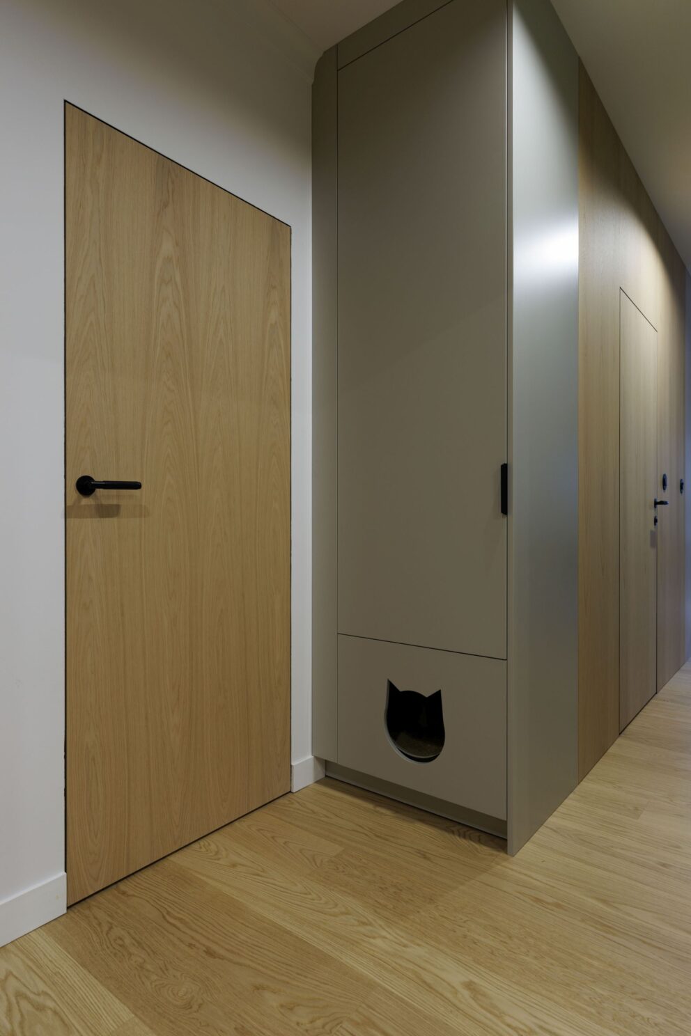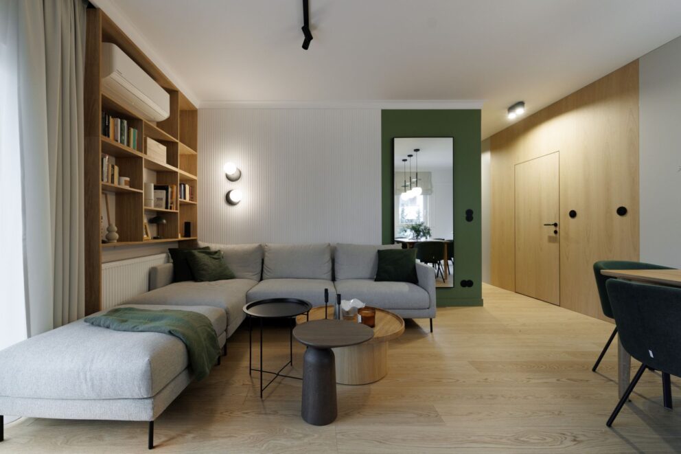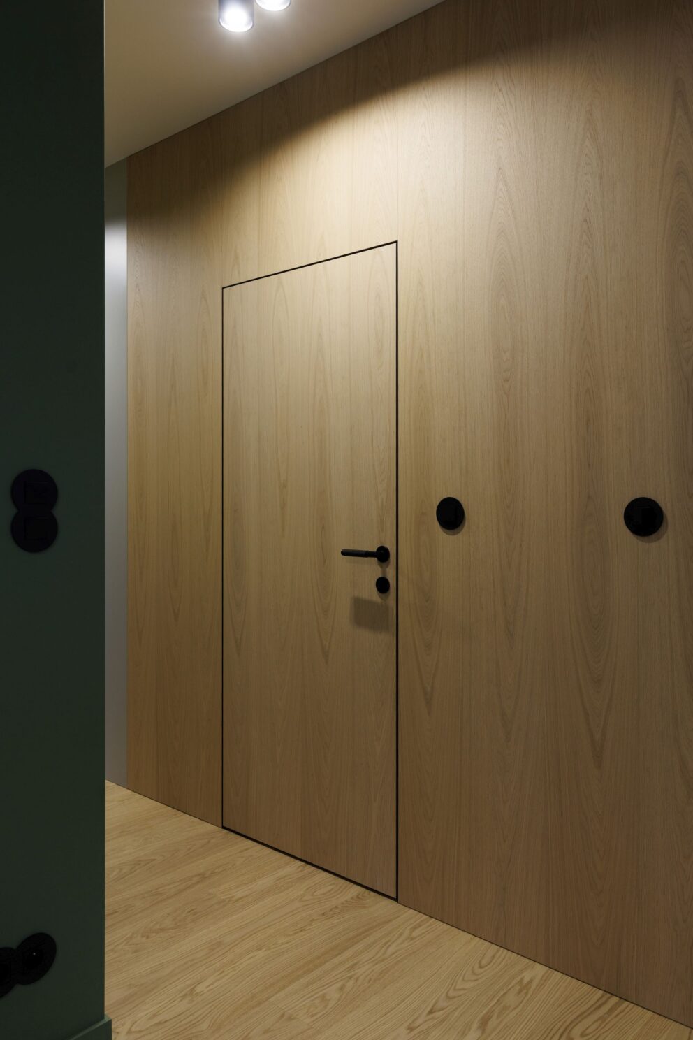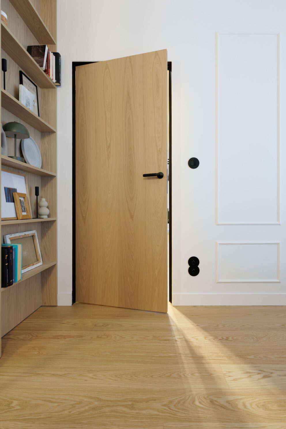Realizacja, która pokazuje, że drewno jest materiałem uniwersalnym i ponadczasowym. W tym wnętrzu zaprojektowanym przez studio Tyma Projekt zamontowaliśmy podłogę drewnianą austriackiego producenta Scheucher Parkett o szerokości ponad 18 centymetrów w selekcji Natur (pozbawionej sęków) oraz jasnym kolorze Perla. Całości dopełniły ukryte drzwi Moric z czarną ościeżnicą oraz wykończeniem ściany w tym samym fornirze.