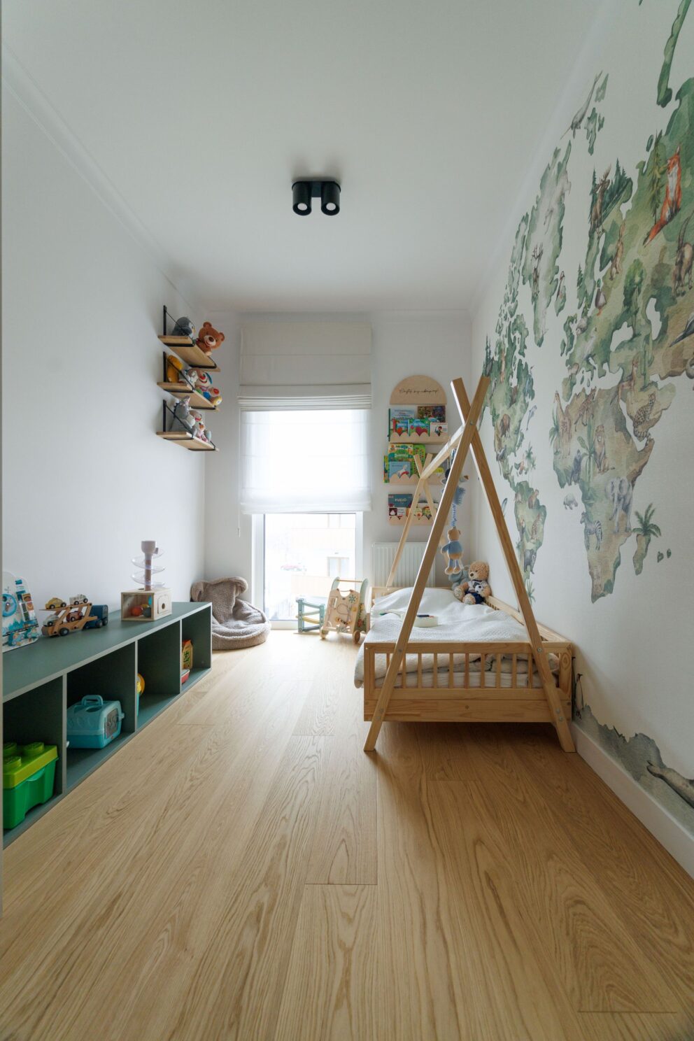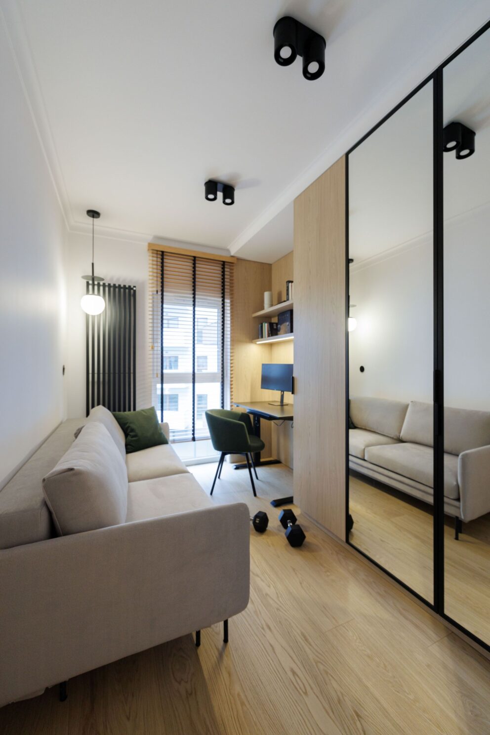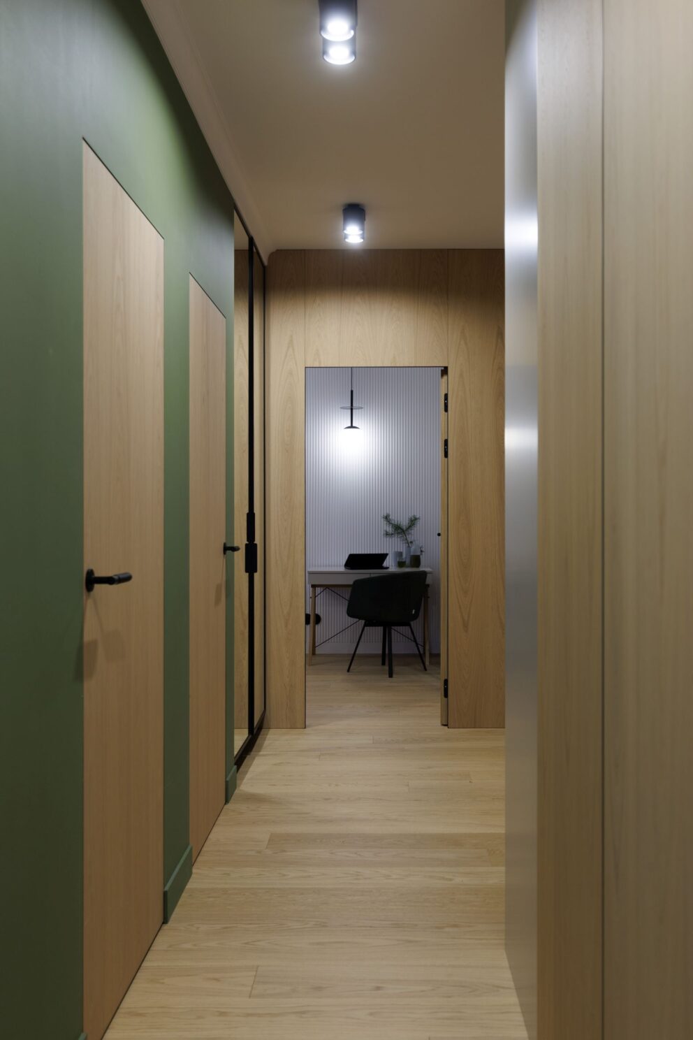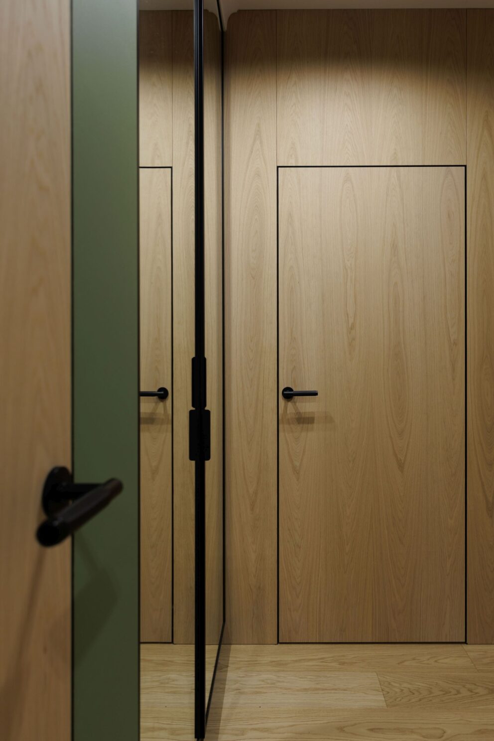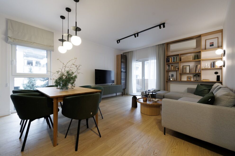 Realizacja, która pokazuje, że drewno jest materiałem uniwersalnym i ponadczasowym. W tym wnętrzu zaprojektowanym przez studio Tyma Projekt zamontowaliśmy podłogę drewnianą austriackiego producenta Scheucher Parkett o szerokości ponad 18 centymetrów w selekcji Natur (pozbawionej sęków) oraz jasnym kolorze Perla. Całości dopełniły ukryte drzwi Moric z czarną ościeżnicą oraz wykończeniem ściany w tym samym fornirze.